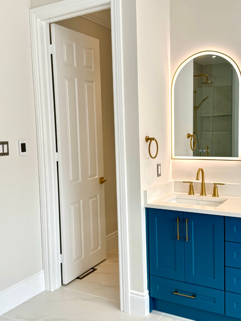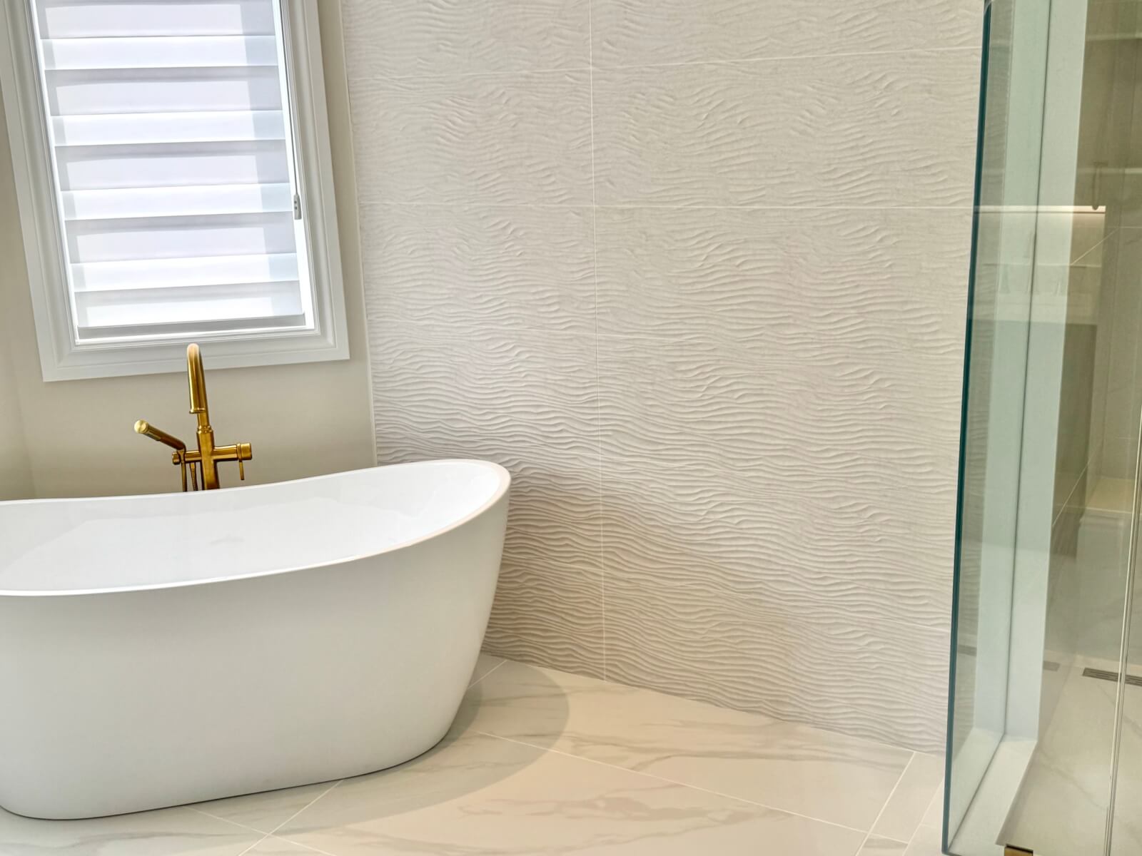 The navy custom vanity with brass hardware anchors the design, while soft marble-look porcelain tile flooring keeps the space bright and refined. The fully tiled walk-in shower includes a built-in bench and niche, all behind a sleek frameless glass enclosure. A freestanding tub sits in front of a textured feature wall, offering both visual interest and a spa-like ambiance. With heated floors and high-end finishes throughout, this bathroom strikes the perfect balance between luxury and function.